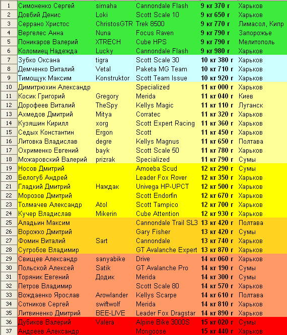 Вот полная таблица со всеми взвешенными велосипедами с этой гонки