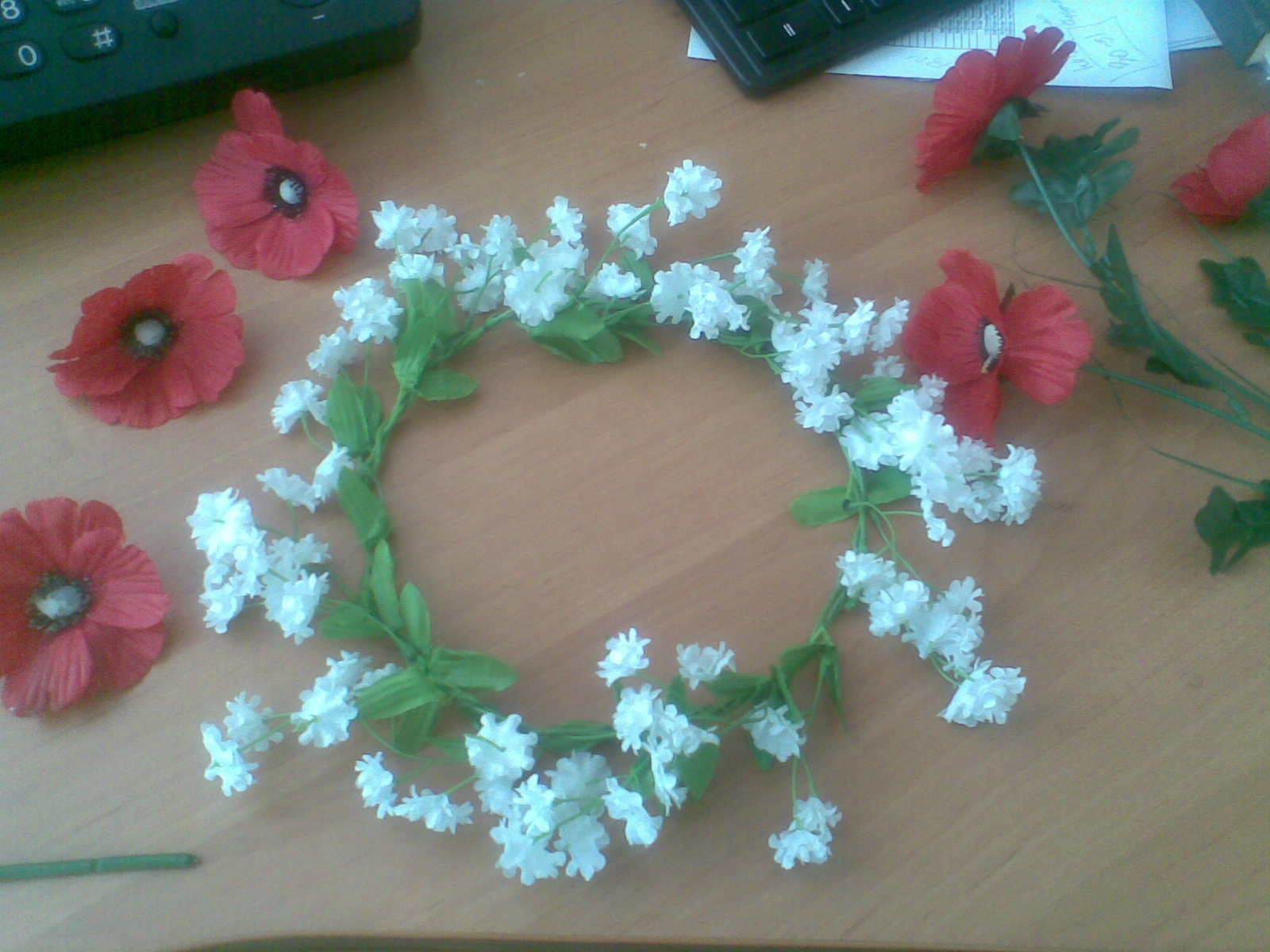 Я достала в худ.кружке венок. Но он просто одоробло по сравнению вот с этим. То, что вы видите - это 5 веточек по 85коп купленные на Барабашово (выход НЕ на эскалатор, возле посуды лотки с искусственными цветами). Дальше под цвет одежды вставляете кто что, кто синие васильки, кто красные маки, кто еще что. Веточка с темя головками цветов стоит 3грн. Вы за 10грн сделаете шикарнейший венок, не поленитесь!