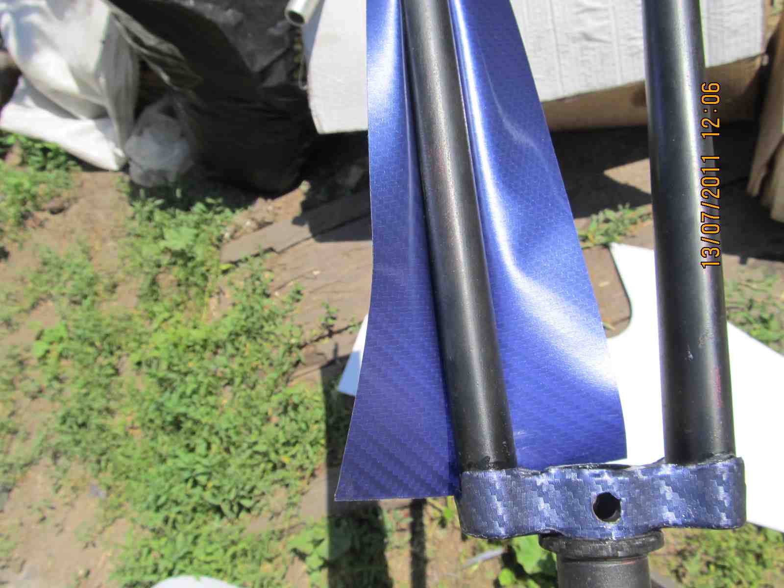По советам решил переклеить вилку в синий карбон,в роде как нормально получилось,вел еще не собирал,как назло сорвалась резьба на петухе,потом решим.Ну вот собственно процесс:тут всё понятно,ничего сложного нет,главное чтобы были руки,материал,который я использывал-это пленка под карбон,синяя maxplus (http://www.youtube.com/watch?v=-4u8lNaXav4)китайского производства,она намного толще чем бельгийский 3D карбон,тянется хуже,покупалась здесь http://www.promdesign.ua/autostyling/ma ... nki/carbon),10х150см, мой инструмент-это нож,зажигалка,клей и еще солнце помогало прогревать пленку и вилку.Начал с того что вырезал шаблон по вилке с листа бумаги(индивидуально к каждой вилке),потом перенес его на обратную сторону пленки,наметил и отрезал,надо отрезать с запасом .Потом отрываю подложку с пленки прикладываю к вилке с фронтона и постепенно обжимаю рукой,выдавливая воздух,при помощи зажигалки растягиваю пленку на узлах,клеем проклеиваю стыки