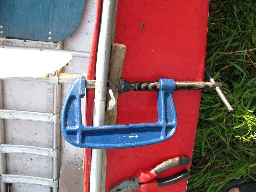 для того , что бы не пользоваться струбциной - пользуйтесь пассатижами - предварительно , еще на базе(дома) подгоните крючки под отверстия в фальбортах. если их правильно выставить - то все собирается на ура. если не будите целовать и облизывать свою посудину - то утопните и удовольствия не получите.