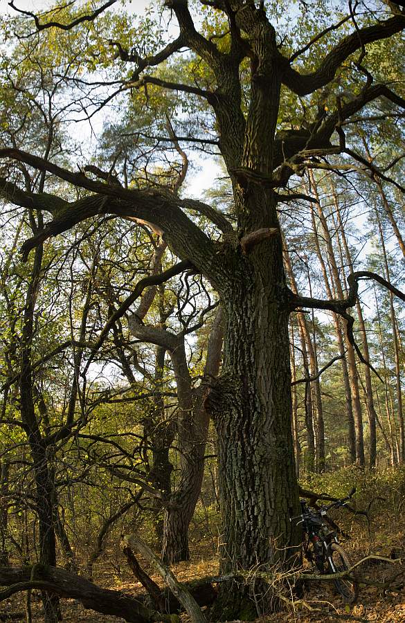 Дуб там, на участке от Лебяжьего до дороги "Меловая - Балцем" отнюдь не один! Насчитал с десяток стволов далеко за полметра диаметром (а это, по-идее, под 200 и более лет); несколько особо впечатливших патриархов с диаметром стволов, подбиравшихся (если не больше!) метра... Особо впечатлил последний, перед стихийным песчаным карьером, который растет посреди леса на крутом 40-градусном склоне, на который я, по лености возвращаться из тупика, дрался с груженым велосипедом :) Вот он - не исключено, что и разменял уже 4-ю сотню лет. Два других щелкнул: