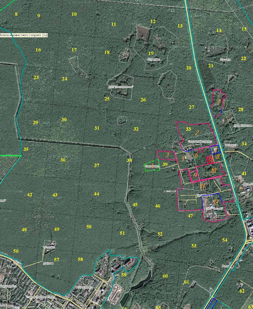 В территорию, окружаемую данным забором попадает вся Зенитовская Поляна и межквартальная просека кварталов 38 и 39 (на схеме территория обозначена оранжевой цифрой 4, обведена зелёным пунктиром, подписана "самозахват").