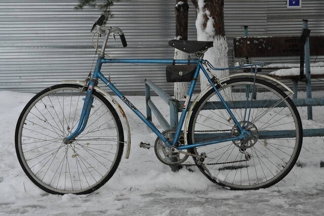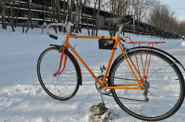 Это да, жалко когда такие аппараты гниют по углам. Этот оранжевый сделал для друга в подарок. Корпел над ним с нового года, отдал в хорошие руки, да и вдвоем кататься веселее. Кстати из неродного только 3 спицы китайские, покрышки родные под вопросом(трещщин нет но вел стоял на сдутых колесах несколько лет- покрыхи повело), вел на удивление сохранился, но перебирать пришлось все, даже седло. Кстати перед фотосессией покатался на нем по снегу-экстрим....