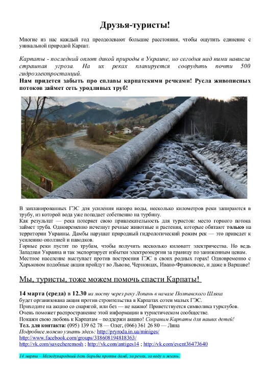 Під гаслом «Збережемо Карпати від забудови малими ГЕС!» 14 березня у містах України та не тільки відбудуться акції проти намірів будівництва 550 малих гідроелектростанцій у Карпатах. Акції організовані винятково громадськими організаціями, жодні політичні сили на акцію НЕ ЗАПРОШУЮТЬСЯ.