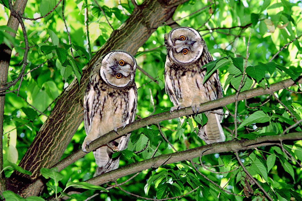 Даю фотки взрослых птенцов ушастой совы, которых я снял лет десять назад на плёнку в Ботаническом саду.