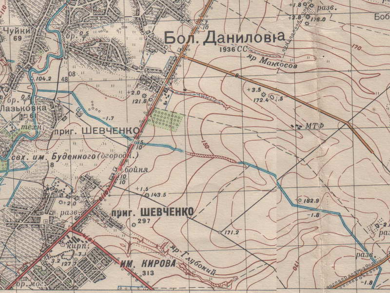 Хотя на приведеном аэрофотоснимке показан другой рубеж обороны, гораздо западнее, пос.Кирова - Селекционная станция. Там тоже "арыки" нарисованы.