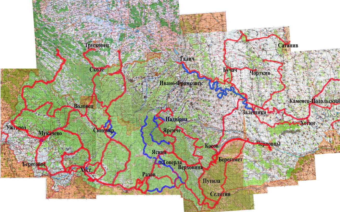 Нитки что успел пройти/проехать по Карпатам, до 2021го. Красным отмечены походы, о которых есть отчеты (или в заготовках, увы много уже "задолжал" :oops: ), синим - что не описывалось и не планируется .