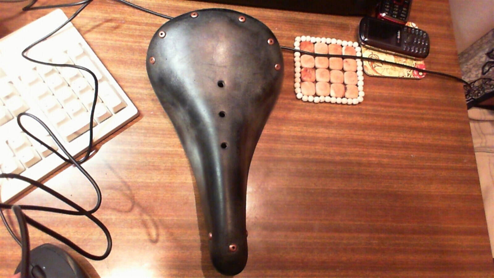 Пришлось каждую из них обрабатывать напильником, превращая \_/-образную головку в плоскую, плющить молотком, полировать (зажатие в патроне дрели очень хорошо себя показало) и только затем клепать. Одну из заклепок (переднюю) пришлось изготовить из медной проволоки - длины описанных выше не хватило. К сожалению, проволоку удалось достать только 4мм и то небольшой кусок (хотя казалось бы - не особо толстая медная проволока, чего тут искать-то? А ведь и эту еле добыл), поэтому желаемых "больших" заклепок а-ля брукс изготовить не удалось..