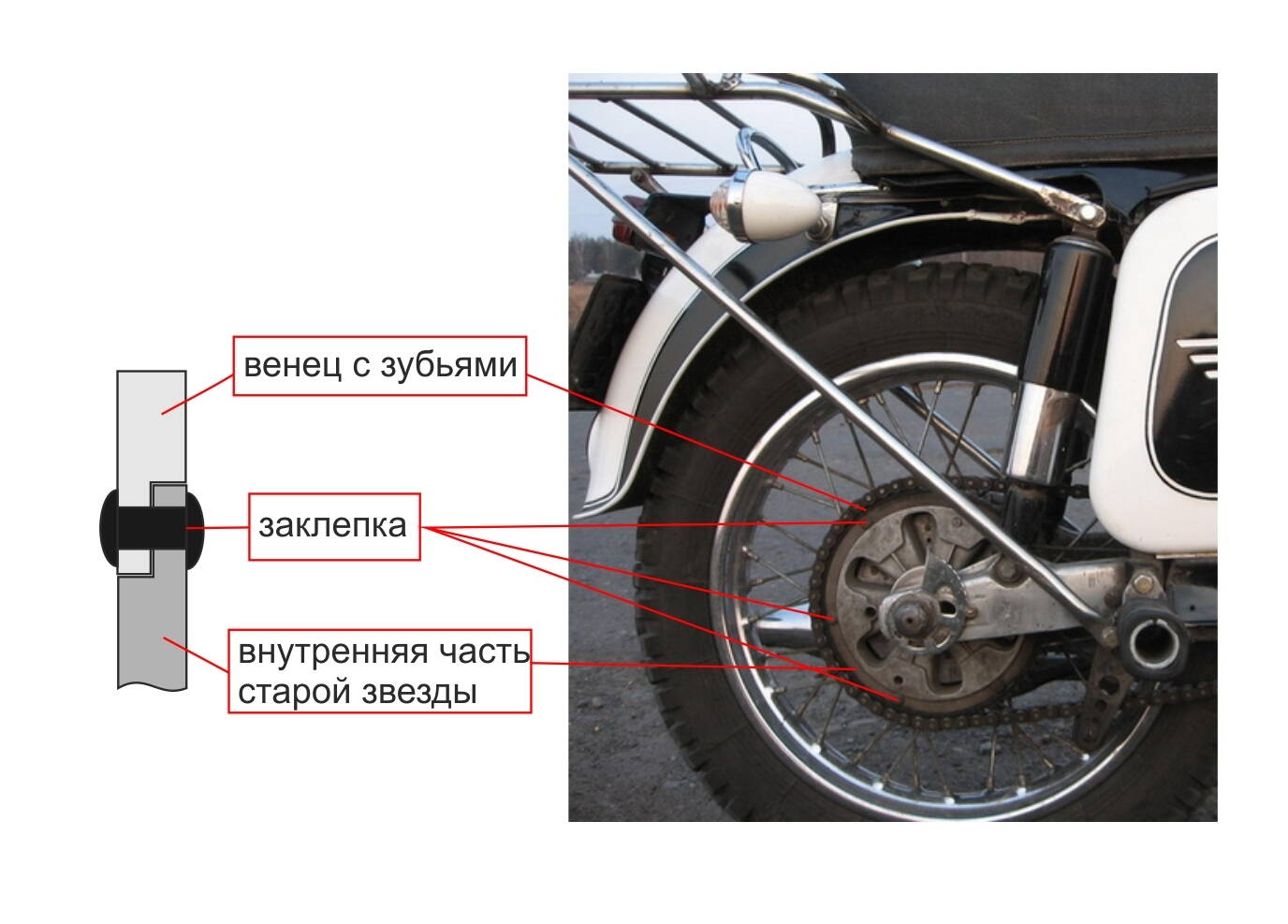 Я себе на ТТРину так и делал - Явская звезда за 30 грн., старая ТТРская звезда, токарные+сварочные работы - новая звездочка. Отходила у меня 10 тыщ. Умерла после Перекотыполя. Щас поставил такую же самопальную.