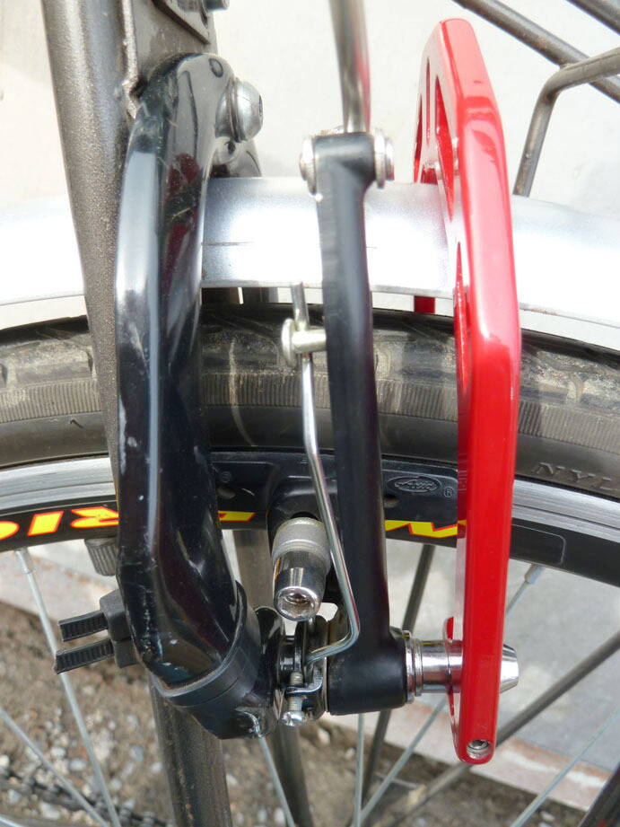 Флексом аккуратно срезаем "подкову", далее, на вершине "подковы" есть отверстие которое более-менее совпадает с отверстием в раме, в которое крепятся стоковые тормоза "клещи".