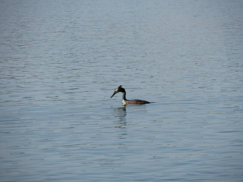 Это чомга или большая поганка. Любит водоемы с достаточным пространством открытой воды. У нас в области из поганок - самая благополучная и многочисленная. Гнездится на всех водохранилищах и крупных прудах, на озерах, иногда и в речных заливах на больших реках. Питается рыбой. У нее еще очень красивые брачные демонстрации, которые можно наблюдать весной.