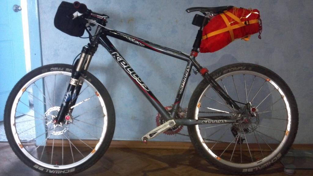 Упаковался. Вся снаряга потянула 4 кг без еды и воды. (+9,45 кг вес самого вела)=13,45кг. Взвешивание вела с обнулением весов в подвешенном состоянии без раскачки и без вела показал -13,40 кг - что на мой взгляд является более точным чем подвешивание болтающегося вела, когда вес фиксируется на весах непонятно в какой момент.