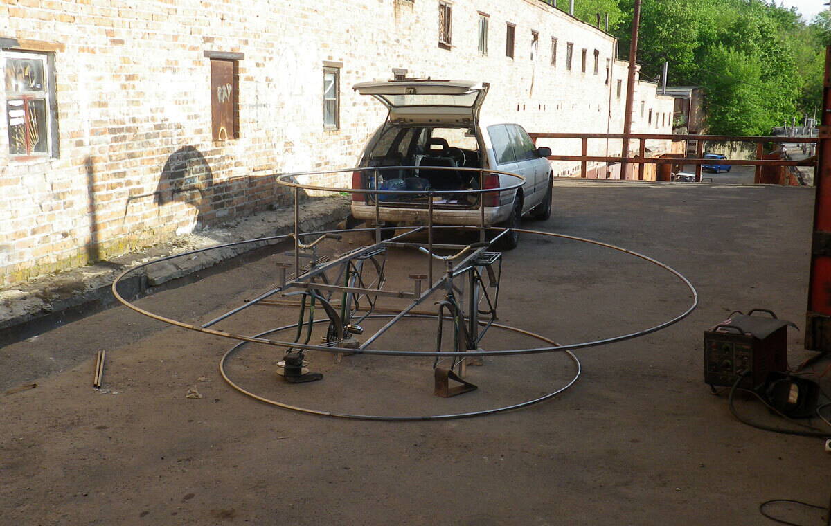 Рули соединяются тягой так что при повороте одного руля, второй тоже поворачивается, но конструкция это не шибко жесткая, поэтому нужно 2 человека, тогда с управлением особых проблем не возникает. Собственно надо понимать, что это хреносоздательство имеет целью не создание удобного веломобиля, создание элемента шоу, который привлечет больше внимания к Велодню и проблемам велосипедистов.