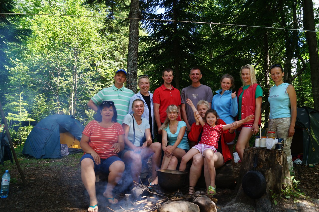 и через 10 минут он добрался и к нам, спрятав все вершины, но мы, уже имея опыт, стали под рюкзаки и двинулись в обратный путь. Спуск и дорога в лагерь на обратном пути заняла у нас чуть больше чем полдня. Подходя к мосту мы встретили группу ребят из Питера, детворе не больше 15 лет и с ними семейная пара руководителей с годовалым ребенком, которые столкнулись с проблемой прохождения моста, но мы им не только показали как его можно преодолеть, но и помогли это сделать и Славик "заработал" шоколадки, которые мы вечером стрескали под чаёк. В лагере нас ждал вкусный борщ, горячий чай и четверо любопытных слушателей, с которыми мы не скупясь на эмоции делились впечатлениями о трехдневном походе. И вот настал последний день нашего отдыха, неделя пролетела молниеносно, как-будто и не было всех этих трудностей, преград, плохой погоды, надо было собирать вещи, а сердце "говорило" - останься еще на неделю, другую и взялись силы, которых так временами не хватало на подъемах, но увы, отпуск не резиновый... Фото на память и в путь дорогу домой