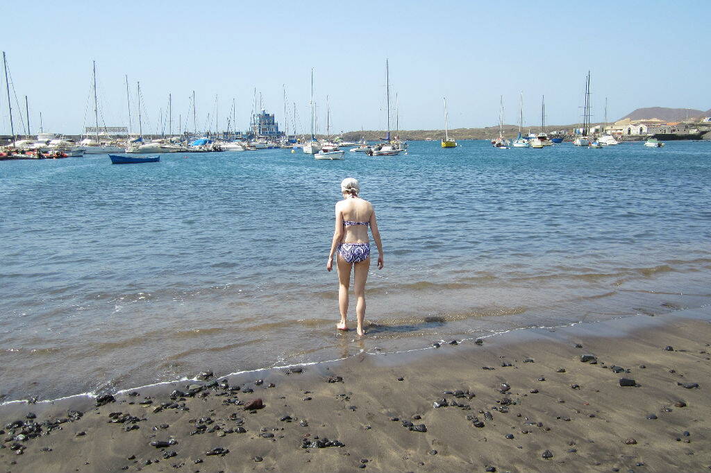 Сегодня мы решили немного потренироваться и посетить близлежащие городки LasGalletas, LosAbrigos и ElMedano. Для начала поехали в «Печеньки» (Galletas). Это скорее не город, а скопление отелей и магазинов. Там я впервые увидела пляж с черным вулканическим песком. У пристани волн нет, так что можно смело искупаться в океане. Вода не очень теплая, но приятная, песок очень горячий.
