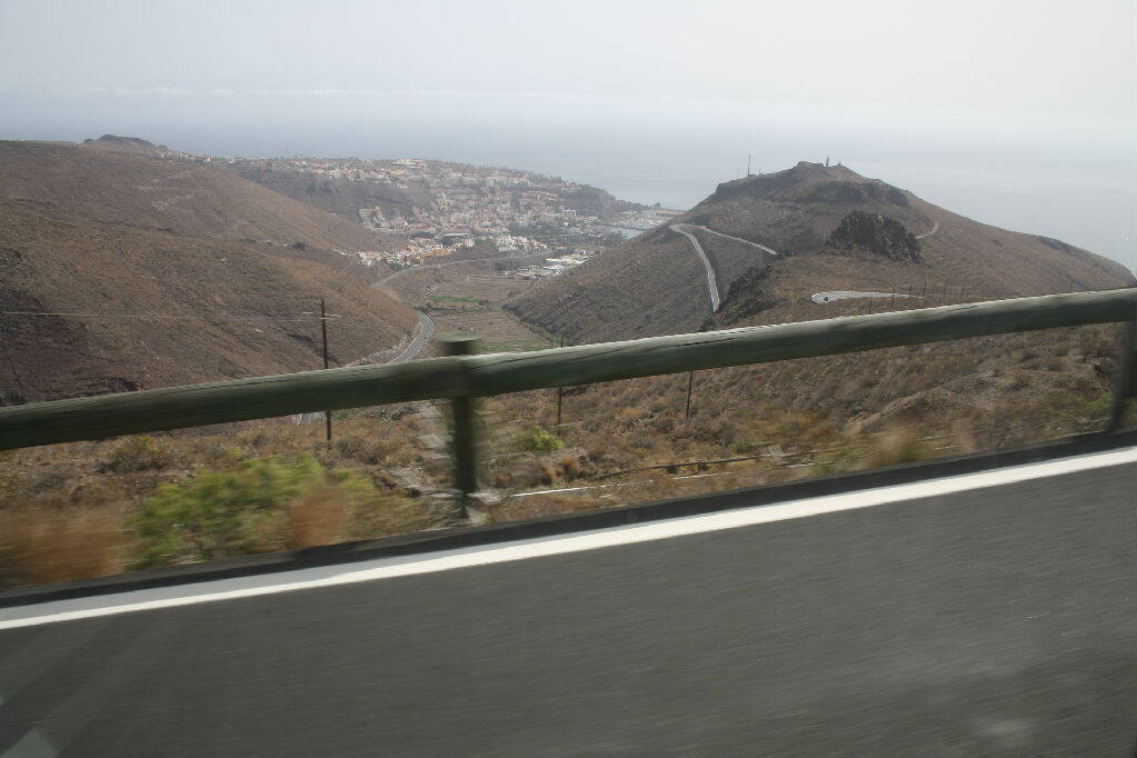 Мы ожидали найти экскурсии в национальный парк «Garajonay» («Гарахонай») с влажным тропическим лесом. Экскурсии нам не подходили, и мы решили посмотреть на другую странную достопримечательность – местный аэропорт. Поехали на автобусе в PlayadeSantiago. Автобус представлял собой маршрутку-мерседес, хотя и комфортную. Дама-водитель весело беседовала с кем-то из пассажиров, пока мы взбирались на крутые серпантины.