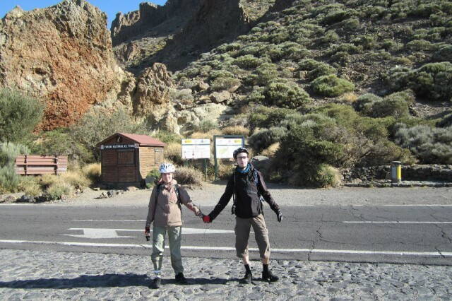 Приехали к автостоянке возле подъемника, пристегнули тандем к перилам у дороги, переобулись, забрали из тандема все ценное (велокомп), пошли покупать билеты на Teleferico. Говорят, что тут воруют на автостоянке, т.к. много глупых туристов в авто из проката оставляют бумажники, камеры, документы. А ввиду близости Марокко спрос на чужие документы для продажи нелегалам всегда есть.