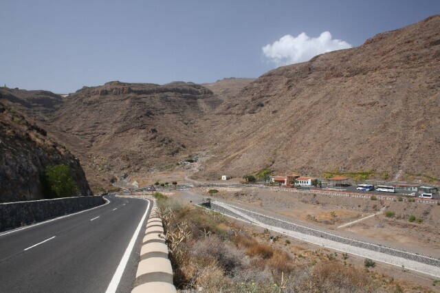 Мы выехали из LasGalletas по направлению к Guaza, там на развязке свернули налево и еще через 5 км подъема (мы им так рады…) были на перевале, с которого спустились практически на набережную. По пути видели бананы в теплицах.