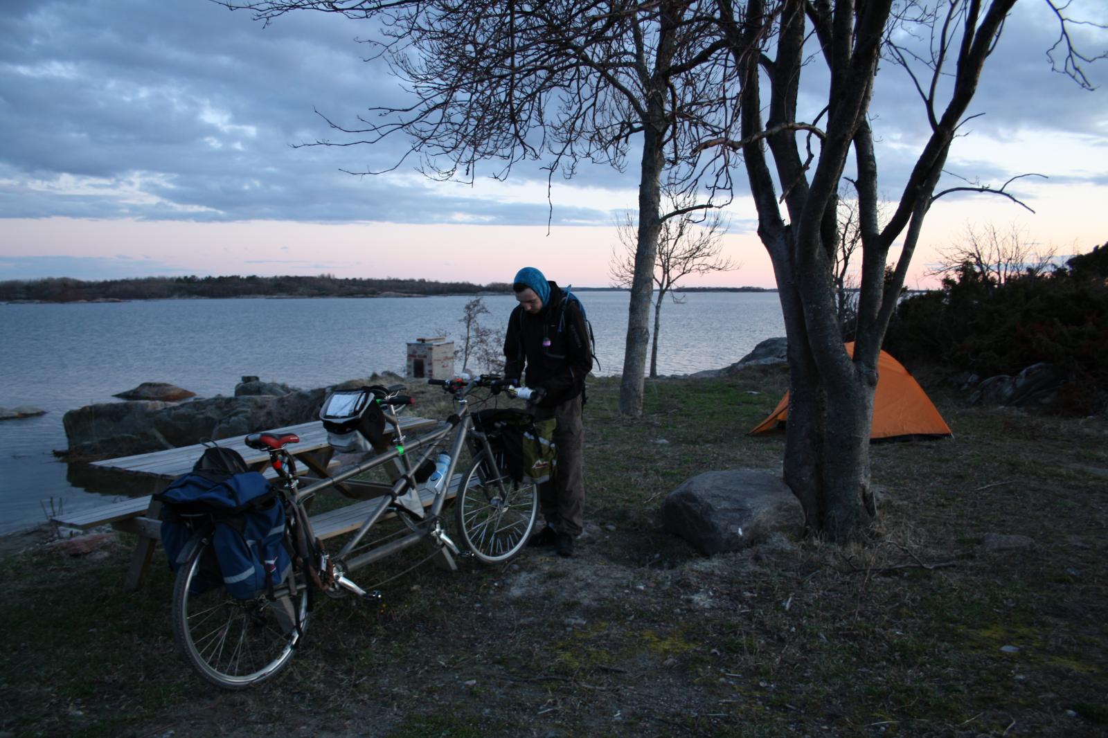 Еще в Турку на вокзале я взяла журнал "Аланд 2011". Он содержал ценную информацию, которую я не могла найти в интернете, а именно даты открытия кемпингов. Изначально мы планировали остановится в отеле-кемпинге Gullvivan. Мы останавливались там в предыдущие два раза. Ввиду холодной и дождливой погоды, мы решили так: если сильно замерзнем или промокнем, то снимем комнату в отеле, если будет терпимо - спим в палатке. Журнал, увы, ничего не говорил о том как работает отель. В комунне Brändö есть еще 3 кемпинга. Об одном журнал умалчивал, другой открывался 1 мая, третий уже работал с 1го апреля. Еще нас волновало то, что мы прибываем около 20 часов вечера. Это значит, что скорее всего рабочий день уже окончен и хозяев можно и не найти. Однако, прекрасная природа и чистый воздух не распологал к волнению.