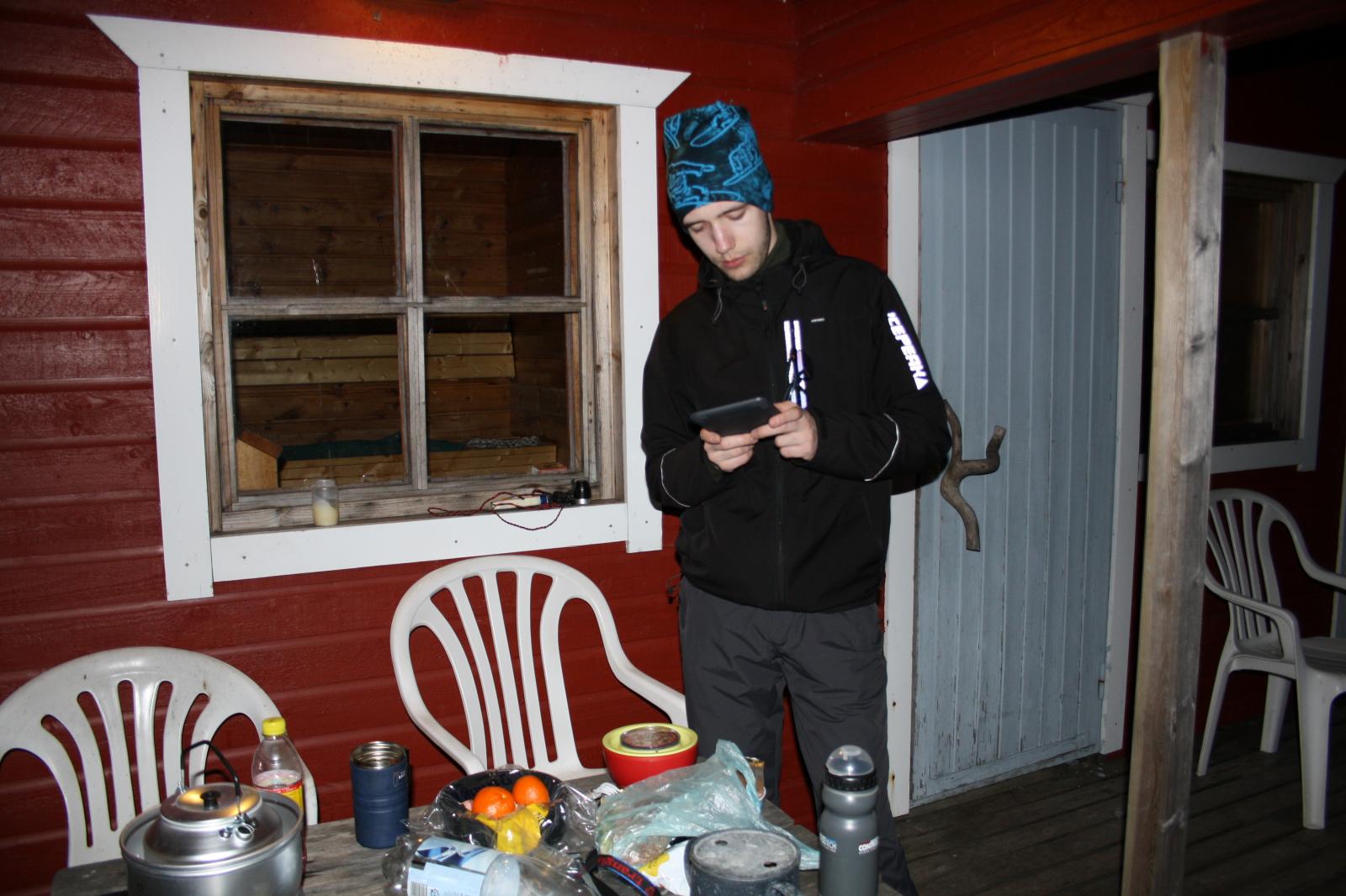 Это растопка сауны. Сауна имеет окно с видом на море и веранду тоже с видом на море. Пока еще не стемнело (до 23 часов) мы могли грется и любоватся морем. Прогревшись в сауне и тепло одевшись, мы приготовили ужин и ели на веранде. Поддерживали сауну в горячем состоянии. Температура за бортом была меньше 5С. А вокруг было только море. Так как там нет городов, то и засветки нет. В просветах между облаков были видны яркие звезды. И тишина.