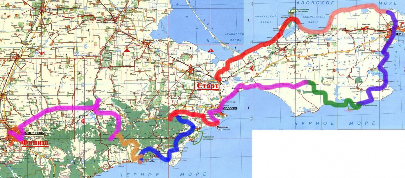 Так как хватало незнакомых отрезков пути, предусмотрел запасные варианты. Учтен был объезд полигона у г.Опук, если там проводились бы учения. Несколько вариантов было и преодоления хребта Туар-Алан, что пригодилось. А так же было три варианта попадания в Белогорск от Морского, в зависимости от погоды. Хотя тут уже прошли по основному варианту.