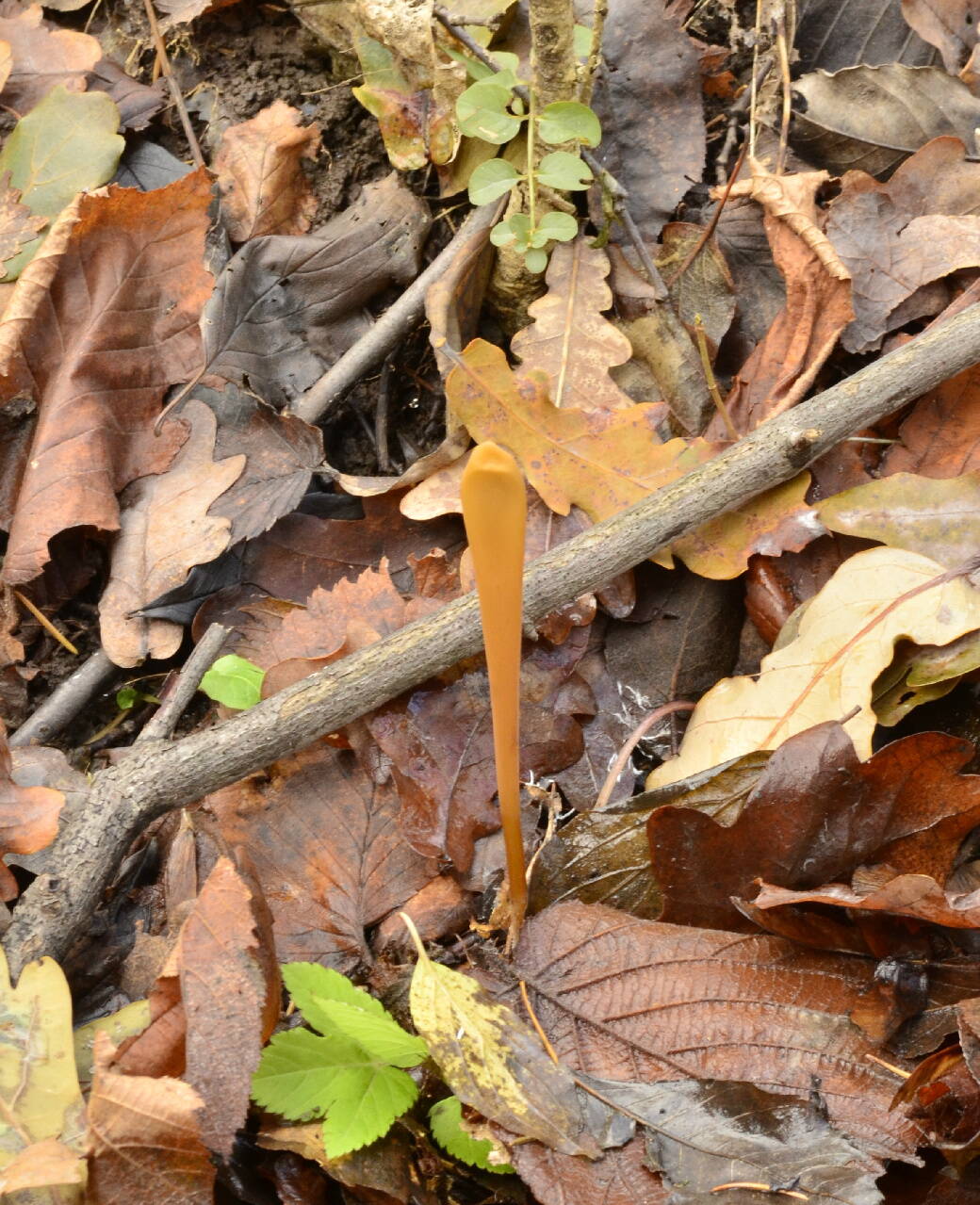 Рогатик дудчатый. Гриб растет среди лесной подстилки на разлагающихся веточках