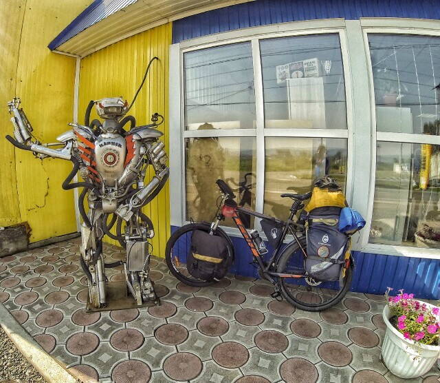 Это Леха, он дальнобойщик и он веломаньяк))) Велик возит в фуре и катает по возможности. Впервые с ним, мы познакомились после Ишима, он угостил меня карасем в сметане, мы обменялись номерами. Теперь, он едет обратно, мы опять встретились по дороге на Новосиб. Леха подарил пятьсот рублей. Спасибо Лехе и дороге, все мы на ней странники)))
