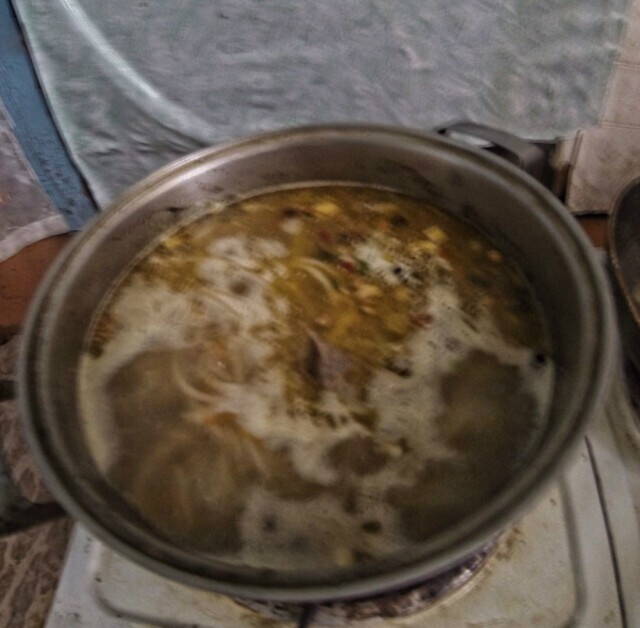 В обед я заехал в поселок набрать воды и не прошло пары минут, как я уже за столом уминал суп, да так, что меня накормили еще и рыбой)))
