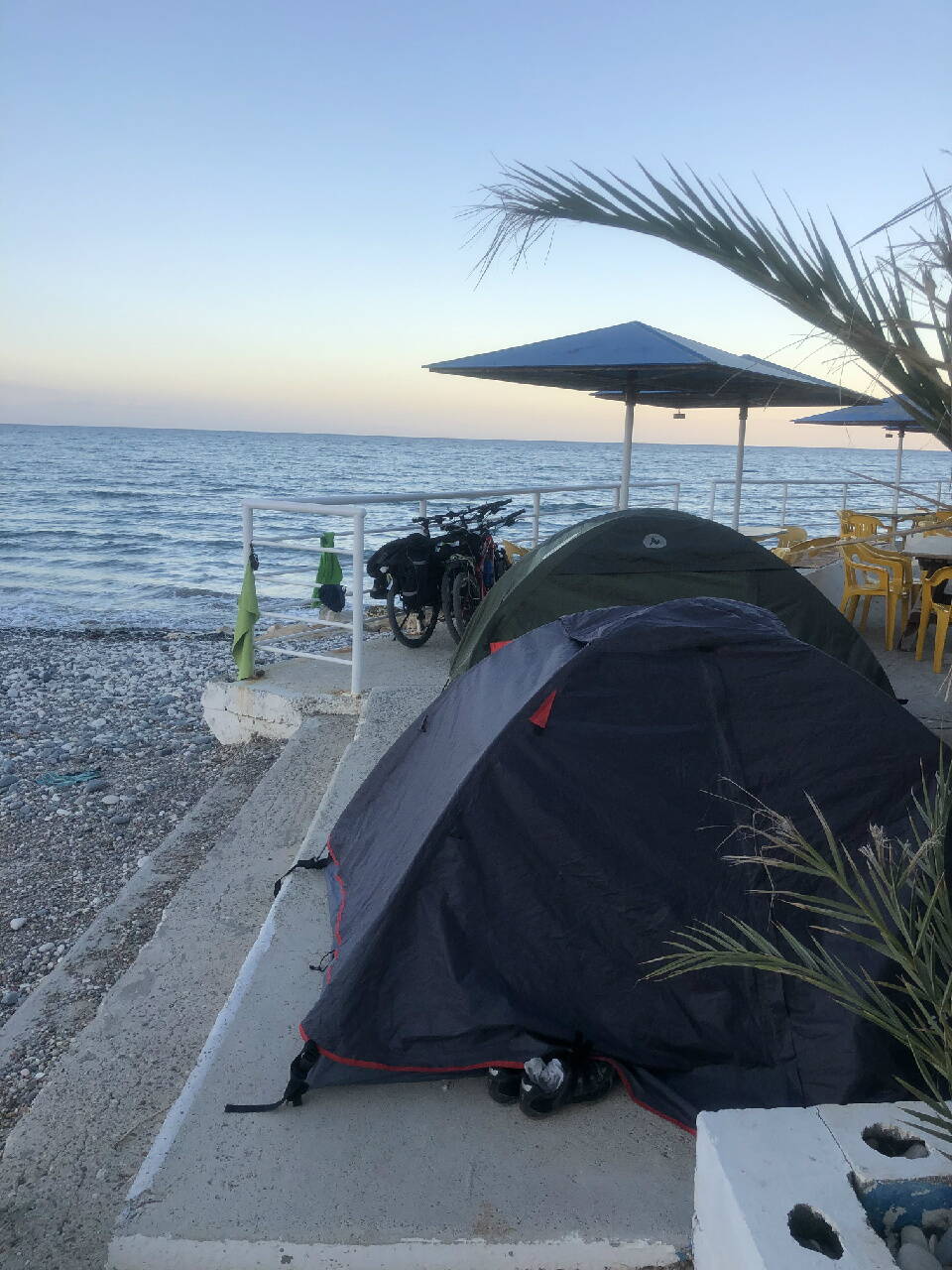 Дякуючи охоронцю та тому, що сезон ще не розпочався нам дозволили поставити палатки прямо на відкритій терасі ресторану. В нашому розпорядженні виявились п'ятнадцять столів, тепле море прямо біля палатки. Пробіг за сьогодні склав майже 100 км.