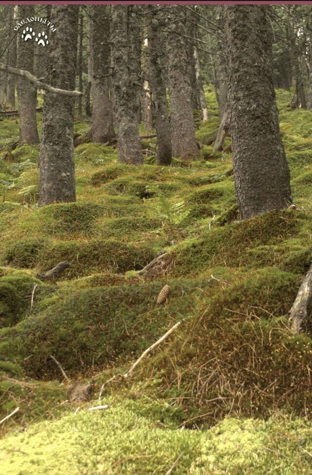 Ноги тонули в моховом ковре, а вокруг древние кедры и ели. Лес чередовался с полянами, заросшими черникой и брусникой, ягоды которых мы с аппетитом поедали. Мы собирали на ходу ягодку за ягодкой. И тут Паша увидел нечто необычное и позвал нас посмотреть. Оказалось, что на одной из таких полян лакомился плодами растений медведь - мы обнаружили его экскременты.