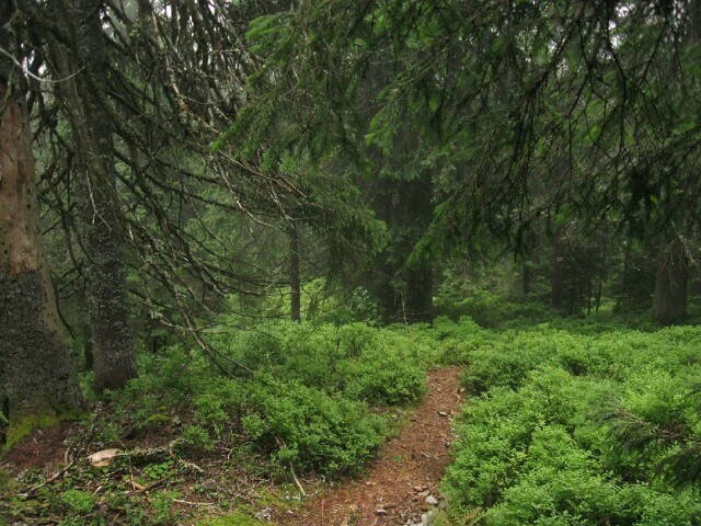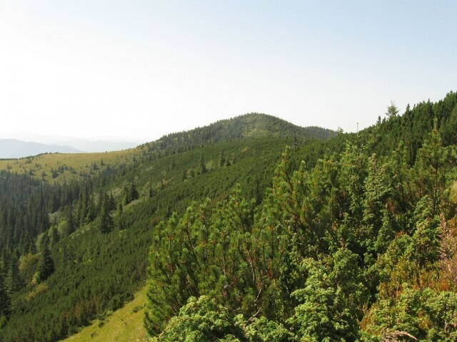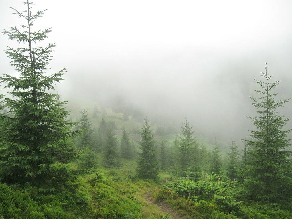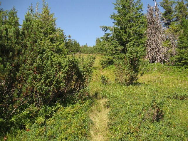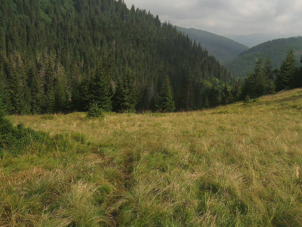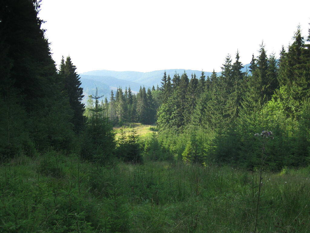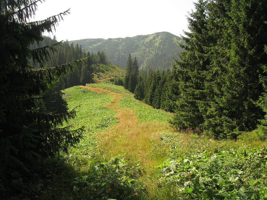 Уже недалеко от полоныны Менчул тропа проходит через светлые полянки с молодыми ёлочками и кочками, покрытыми приторно пахнущим на солнце мхом. Дальше ещё недолгий участок очень приятного леса и выход на саму полоныну.