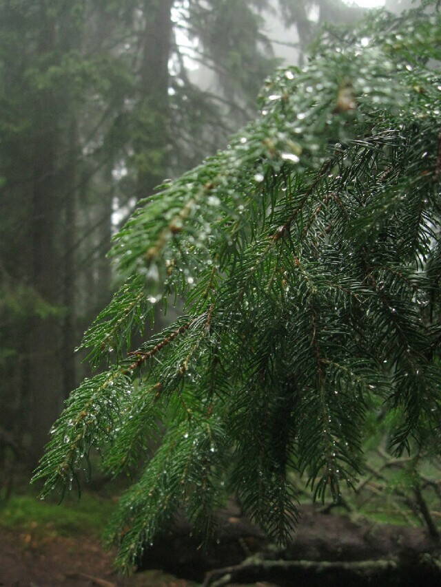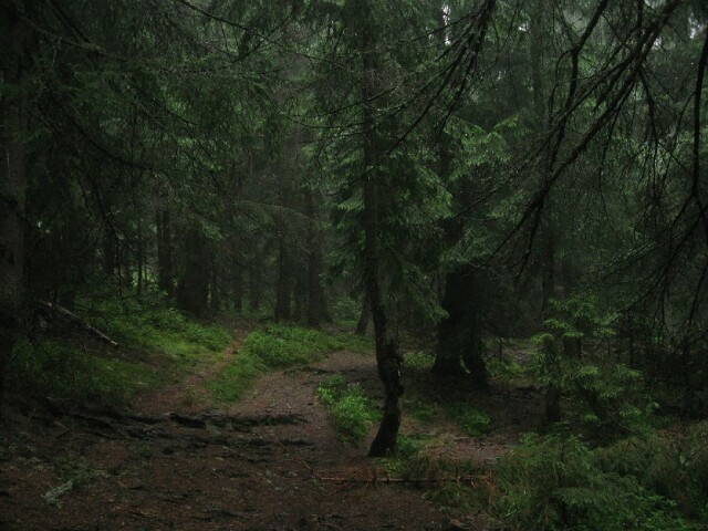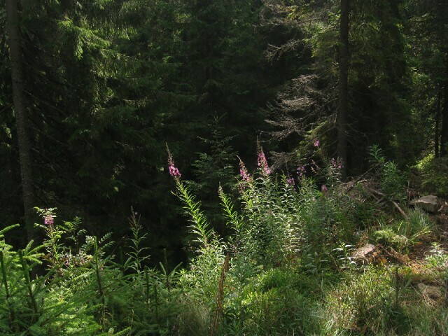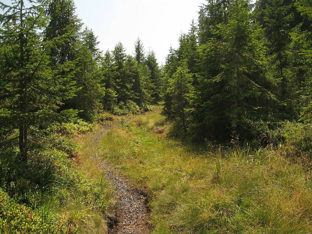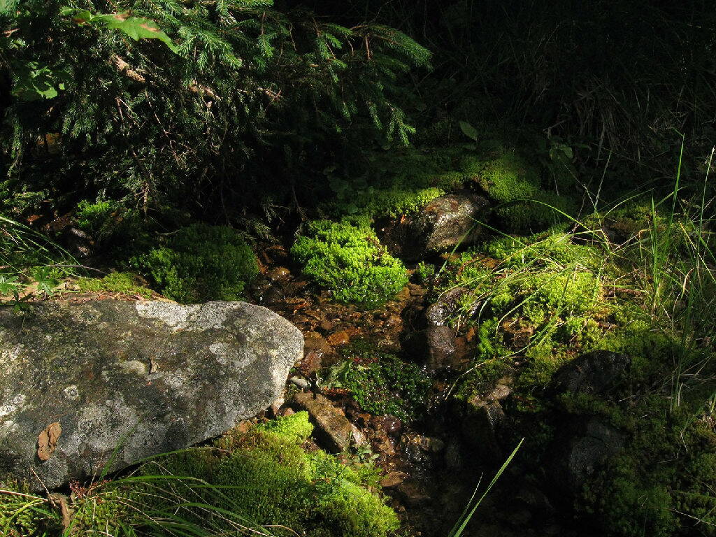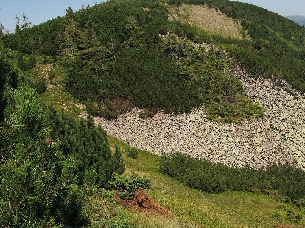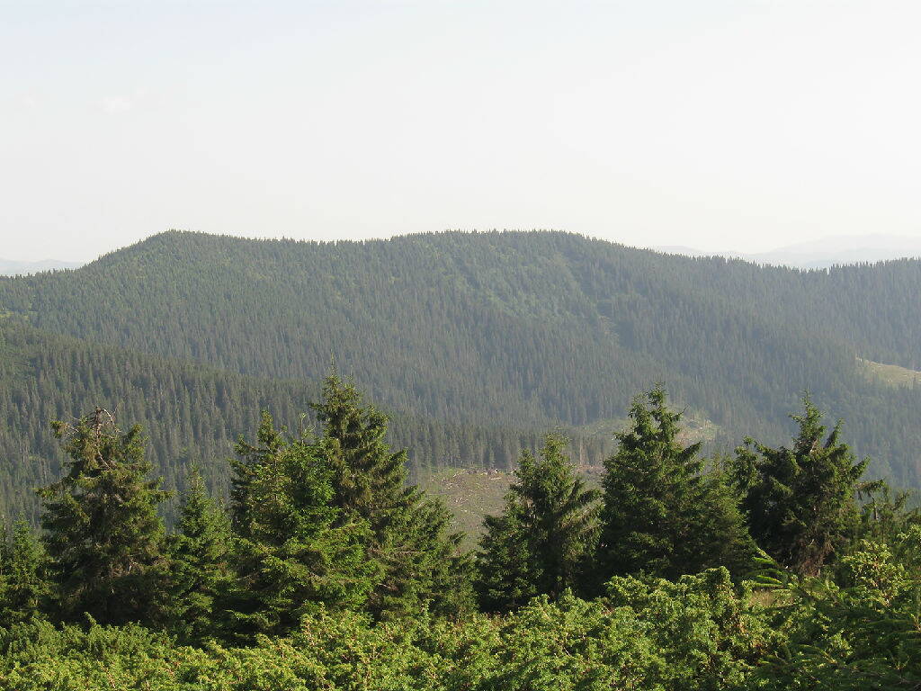 Уже недалеко от полоныны Менчул тропа проходит через светлые полянки с молодыми ёлочками и кочками, покрытыми приторно пахнущим на солнце мхом. Дальше ещё недолгий участок очень приятного леса и выход на саму полоныну.