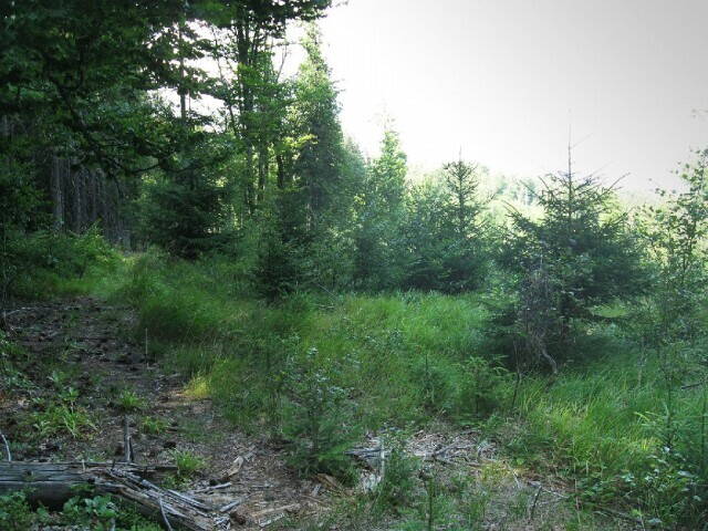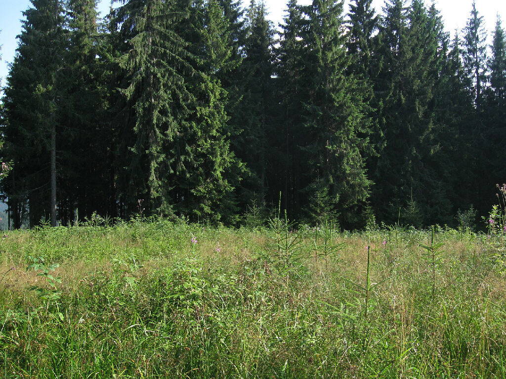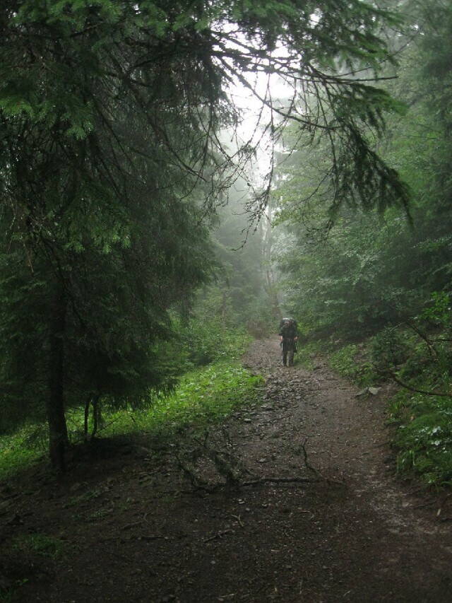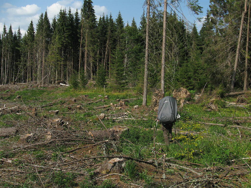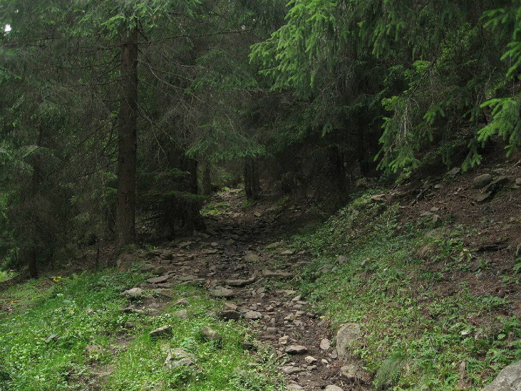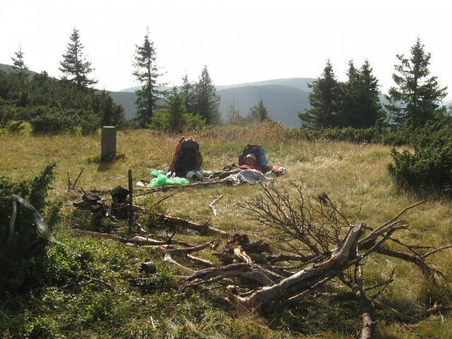 Потом минуем ещё одну старую вырубку с развилкой дорог. Нужная нам уходит налево вверх, и заходит в лес. На сегодня это последняя вырубка, дальше только лес, полянки и полоныны (точнее получилась только одна полонына Менчул в этот день, хотя по плану должны были сегодня же пересечь и Татул, но, как всегда, всё пошло не по плану :)).