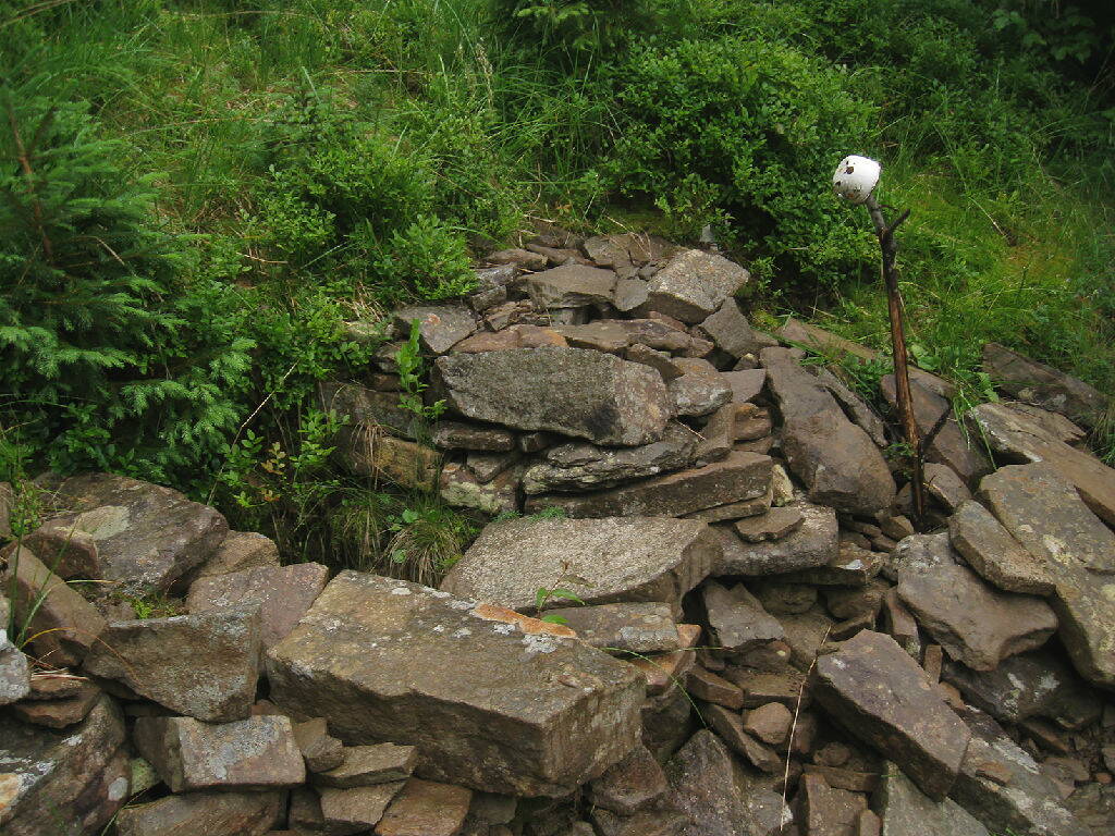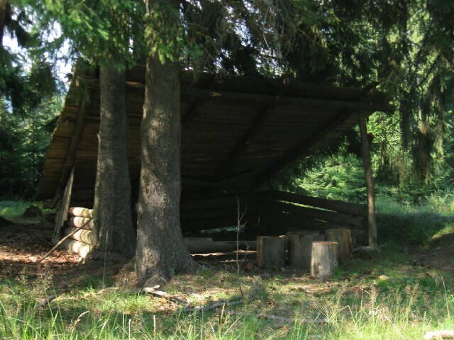 Так как дождь расслабляться не даёт, то привал с перекусом делаем уже когда вышли на полянку с колыбой-розвалюшкой у потока недалеко от полоныны Ворожеска. Эта розвалюшка и стала нам временным приютом и укрытием от непогоды. По счастью, половина крыши на ней ещё уцелела, что дало возможность неплохо обсохнуть за время привала. Навстречу нам по дороге от озера Ворожеска спустилась сборная группа под руководством молодого паренька из Тернополя. Поболтали с ним немного, показали где начало тропы (здесь, по самой полянке, как таковой тропы не наблюдается).