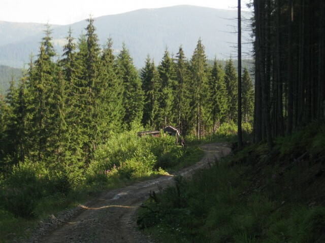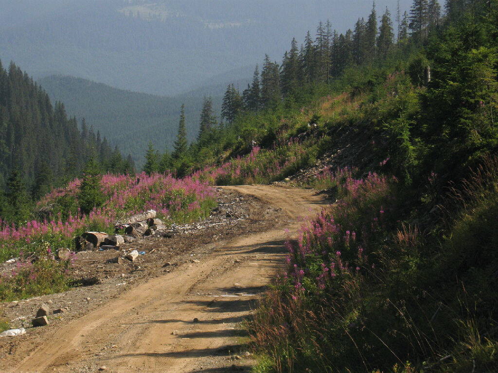 Дорога проходит мимо домика лесников и устремляется на плавный подъём. Идёт через участки старых вырубок, где уже поднялась молодая поросль, и через участки не очень старых вырубок, где хозяйничают малина с ежевикой. Вправо открываются виды на окраину с. Черная Тиса, противоположные склоны с редкими постройками, вырубками, лесом и полоныну Погарский, венчающую склон. Наконец заходим в лес, где останавливаемся на небольшой привал с завтраком.