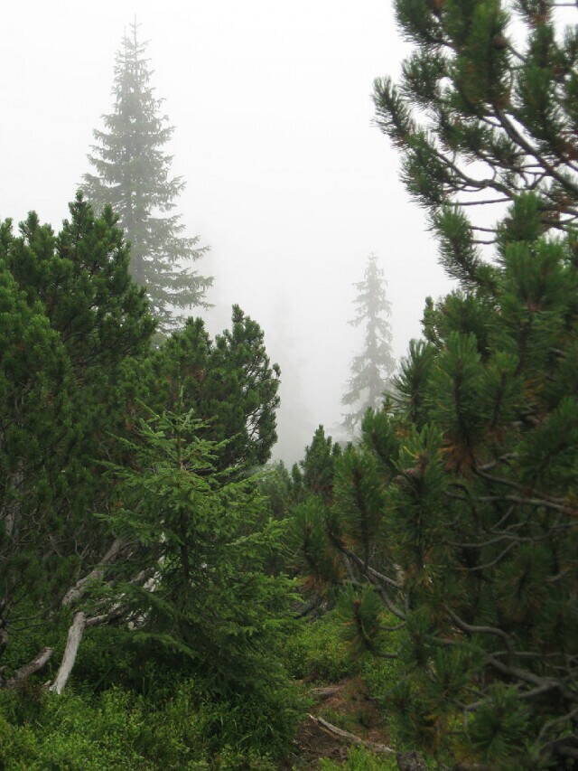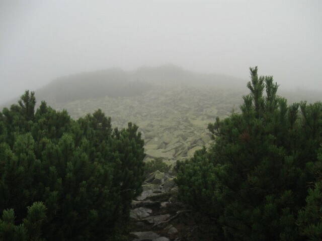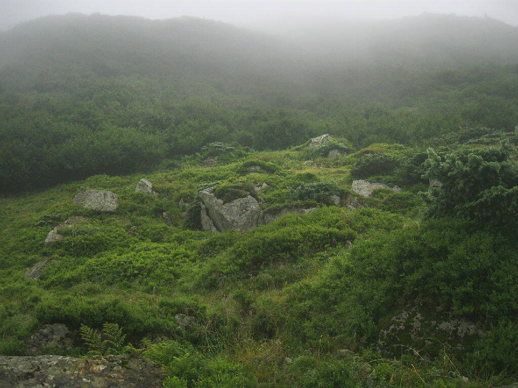 Однако, и похолодало ж к вечеру. Продолжает слабо моросить. Туман становится плотнее, видимость уменьшается. Ставим палатку. Внизу по тропе возвращаются с прогулки часть обитателей домика. Детвора растянулась и часть группы, видимо, отстала. Увидели нас, одна девчонка подошла, спросила кудой к домику. Показали. Ужин уже в палатке и отбой. На завтра нам остался только спуск под Осмолоду, поэтому спим завтра «досхочу».