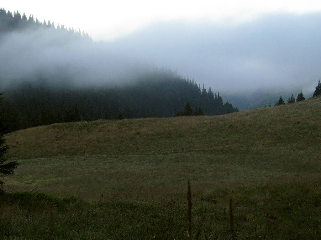 Дождь прекращаться и не думает. По размокшей за ночь дороге поднимаемся к полянке под Татульским Менчулом. Оттуда, полого спускаясь, дорога приводит на полоныну Татул. Сквозь завесу туч слабо, а затем все четче, прорисовываются контуры домиков пастухов.