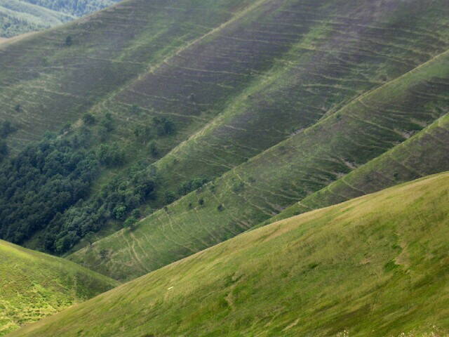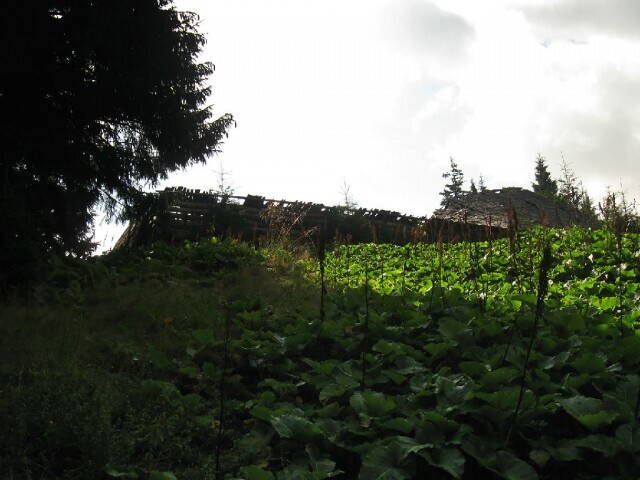 Здесь, в верхней части полоныны, чуть ниже тропы в высокой траве заметны развалины какого-то деревянного строения, его крыша лежит чуть ниже по склону, у самой тропы скучает по звонкому голосу воды сухая поилка. С нижней же части полоныны до нашего слуха периодически долетают звуки какой-то деятельности и голоса.