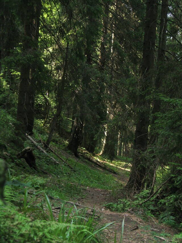 Разворачиваемся, возвращаемся в лес и ищем нужный нам путь наверх к полянке под Татульским Менчулом. Довольно быстро находим его у места, где дорога делает поворот. Почему мы его не заметили, когда проходили здесь первый раз? — потому, что как такового ответвления в этом месте и не видно, так как весь склон голый, т.е. только грунт, ни травы, ни опавшей листвы/хвои, чтобы как-то оттенить дорогу. Плюс само начало этой тропы, похоже, находится у захода в лес с полоныны Менчул. Я видела там, что выше нашей дороги на пару метров параллельно идёт какая-то ещё, но почему-то пошлось по этой нижней, более натоптанной показалась что ли…. Ну да ладно. Любой блуд приравнивается к разведке. Просто не нужно выключать внимательность.