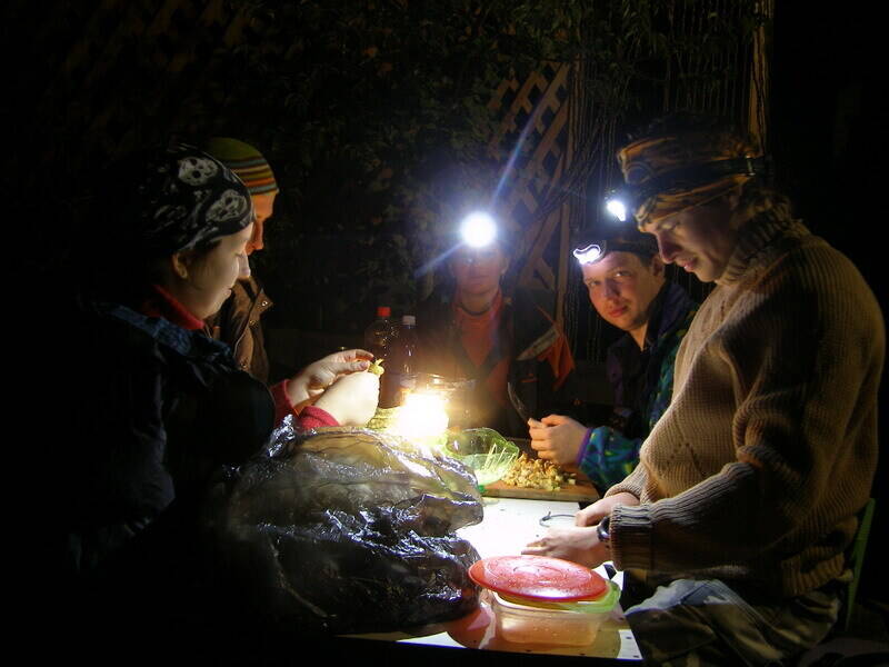 Возвращались назад уже в сумерках, а к лагерю подошли по темноте. GPS оказался весьма не лишним. Нашли сныканные грибы и отволокли добычу в лагерь. Ко времени нашего прихода ребята еще не закончили выемку и последний человек покинул пещеру окло часу ночи. Погода испортилась и мы решили отменить запланированный на завтра сброс по Мисхорским гротам.